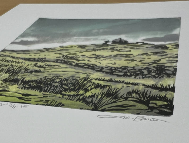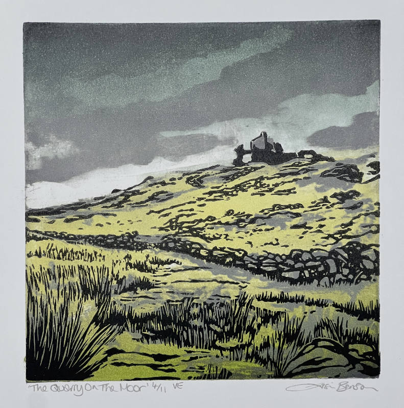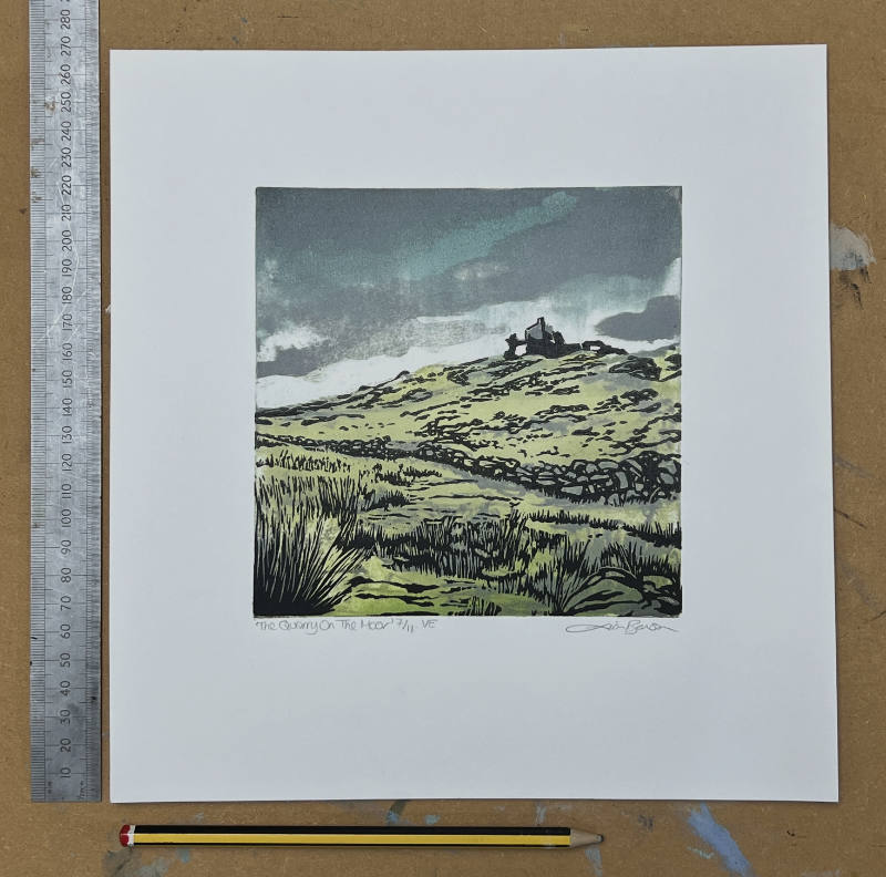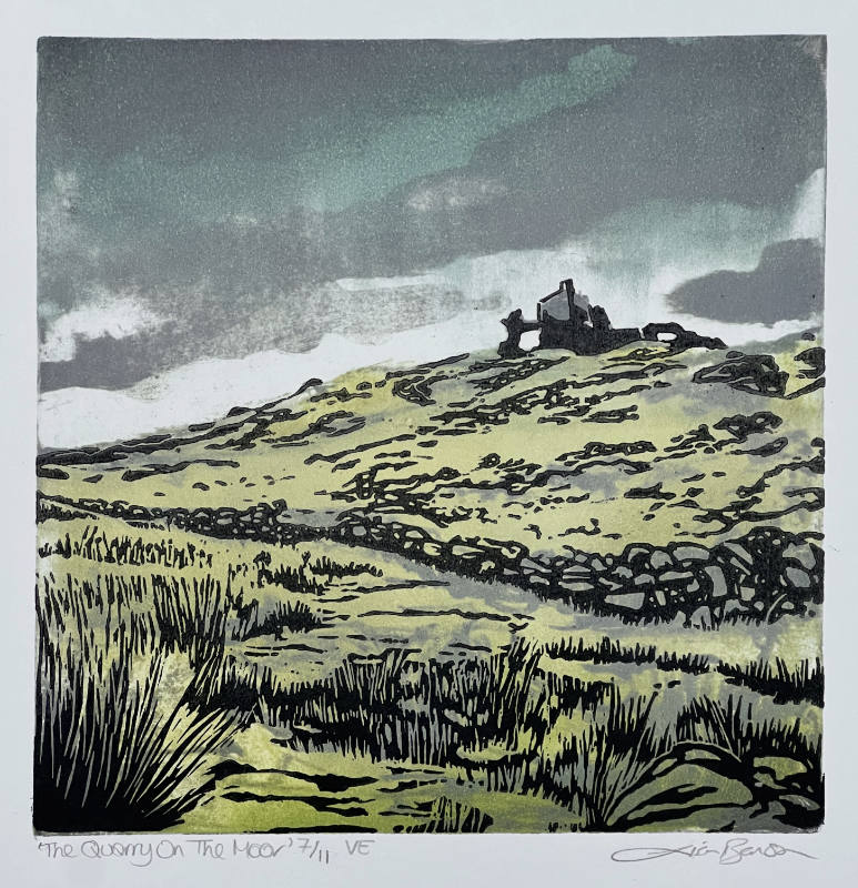 I printed The Quarry On The Moor using two different techniques, linocut and lithino. Lithino is a process that uses the piece of lino to create a lithography plate. I used the marks I made on the lino to create the wild skies and the shadows that fall across the landscape. I then carved into and printed the lino to create the stronger shapes and marks over a couple of layers.